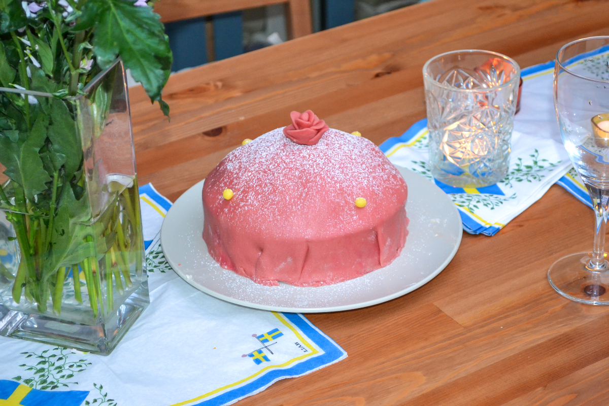 This year the process repeated, and another princess cake was made. The princess cake is layers of sponge with raspberry jam and vanilla custard in between; with whipped cream mounted dome-like on top; and the whole then covered by coloured marzipan. Icing sugar is typically sifted on top of the marzipan; and more marzipan may then be added by way of decoration, along with more cream, or sometimes melted chocolate.
